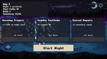 Move between key points at night, collect faith, repair the cemetery, and ring ritual bells to summon undead defenders.